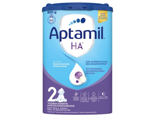 Aptamil HA 2 follow-on formula is ideal after 6 months. This hydrolyzed follow-on formula with gently broken down protein supports your baby's immune system. Vitamins C and D (required by law for follow-on formula) contribute to normal immune system function.